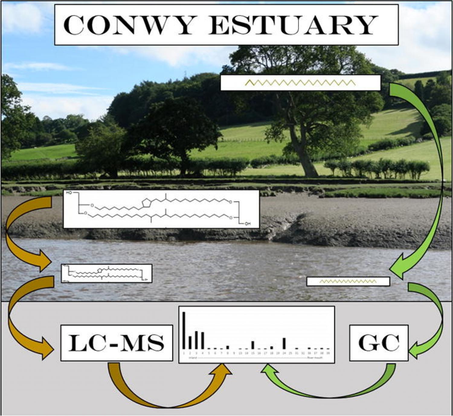 Owing to their restricted riverine flow and greater numbers, small estuaries (annual discharge < 2000 m3 s−1) are important sites of organic carbon (OC) storage in sediments. The Conwy Estuary is an exemplar small rural-agricultural catchment which delivers a diverse pool of terrestrial OC to the Irish Sea. Thirty-nine surface sediments, covering a distance of 10.5 km, were taken transversal as well as longitudinal to the estuary to examine local and distant catchment inputs. Biomarkers (branched Glycerol Dialkyl Glycerol Tetraethers - brGDGTs, n-alkanes) and molecular and bulk proxies (BIT, Paq, TAR, δ13C, C/N), showed sediments were dominated by terrestrial inputs, with only sediments of the three most seaward sites showing stronger physical and geochemical characteristics of a marine influence (e.g., sandier sediments and lower BIT). Biomarker concentrations in the Conwy were comparable to the more urbanised Thames and the Clyde estuaries. The three estuaries showed similar fractional abundance of the brGDGTs, recording an inverse trend between the hexamethylated and the tetramethylated brGDGTs, and showing the pentamethylated brGDGTs as the dominant group. A systematic decrease in terrestrial biomarkers from bank to the main channel confirmed either a strong localised erosion/runoff process or a decrease in water velocity leading to a higher deposition.